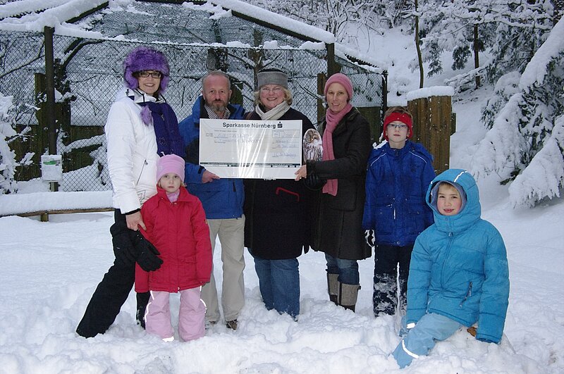Dr. Mägdefrau freute sich über die Spende für die seltenste Eulenart Deutschlands. Im Bayerischen Wald – der westlichsten Spitze ihres Verbreitungsgebietes – war diese Eulenart bis Ende des 19. Jahrhunderts Brutvogel. Auf der tschechischen Seite wurde der letzte Vogel 1926 erlegt. Um die Art wieder heimisch werden zu lassen, läuft seit 1975 ein Projekt zur Wiederansiedelung dieser eindrucksvollen Tierart im Nationalpark Bayerischer Wald. Hier engagierte sich der Tiergarten Nürnberg bereits mit der Auswilderung von 13 Eulen. Der Tiergarten finanzierte genetische Untersuchungen dieser Tierart durch die Technische Universität München.