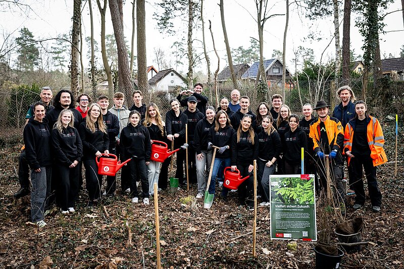 Von der Hainbuche über die Flaumeiche bis hin zum Burgenahorn: 23 Auszubildende der Sparkasse Nürnberg haben am gestrigen Dienstag, 10. März 2026, gemeinsam mit Fachleuten des Tiergartens Nürnberg und des Amts für Ernährung, Landwirtschaft und Forsten (AELF) Fürth-Uffenheim mehr als 130 Zukunftsbäume im Stadtwald bei der Kleingartenkolonie "Königshof" gepflanzt. Dabei ordneten sie die Setzlinge im Pflanzschema des sogenannten Nelderrads an – eine innovative Form der Baumpflanzung. Die Aktion ist Teil der Kooperation "Vielfalt sichert Zukunft" zwischen der Sparkasse Nürnberg und dem Tiergarten als städtischem Forstbetrieb. Ziel dieser Kooperation ist es, bis 2032 insgesamt 200 dieser Nelderräder zu pflanzen. Rund 70 sind seit 2022 bereits entstanden.