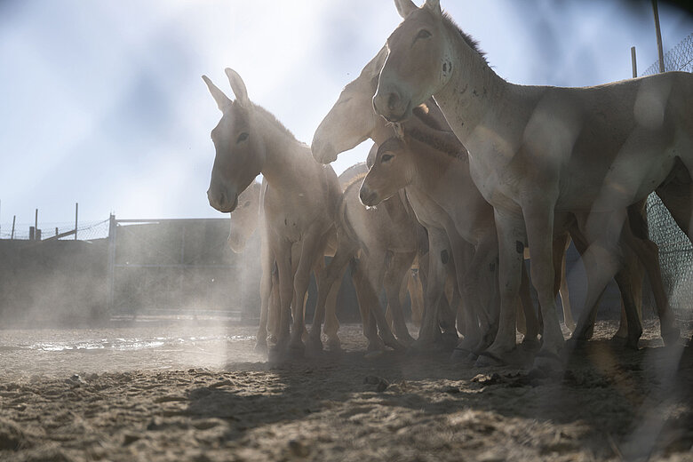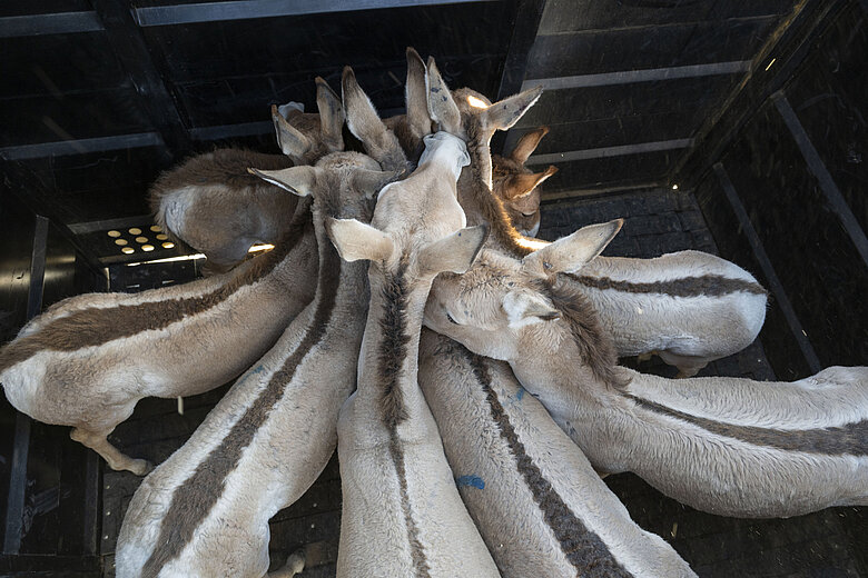 Angekommen am Zielort im Altyn Dala Naturschutzgebiet wurden die Wildesel in das vorläufige Akklimatisierungsgehege entlassen. Trotz der umfangreichen Maßnahmen, welche die Expertinnen und Experten ergriffen hatten, um Verletzungen oder Schlimmeres während solch komplexer Umsiedlungen zu vermeiden, kann es zu gefährlichen Zwischenfällen kommen. Das Team achtete bei der Zusammenstellung der Kulan-Gruppe für die Umsiedlung darauf, eine harmonische Herde mit intakten sozialen Strukturen auszuwählen. Zusätzlich wurden die Tiere vor dem Verladen sediert, um Stress zu vermeiden.
